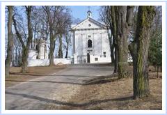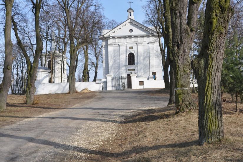 Szeroka aleja, wysadzana zabytkowymi lipami, lekko wznosząca się ku wzgórzu prowadzi nas do kościoła. Świątynia otoczona jest murem z czterema