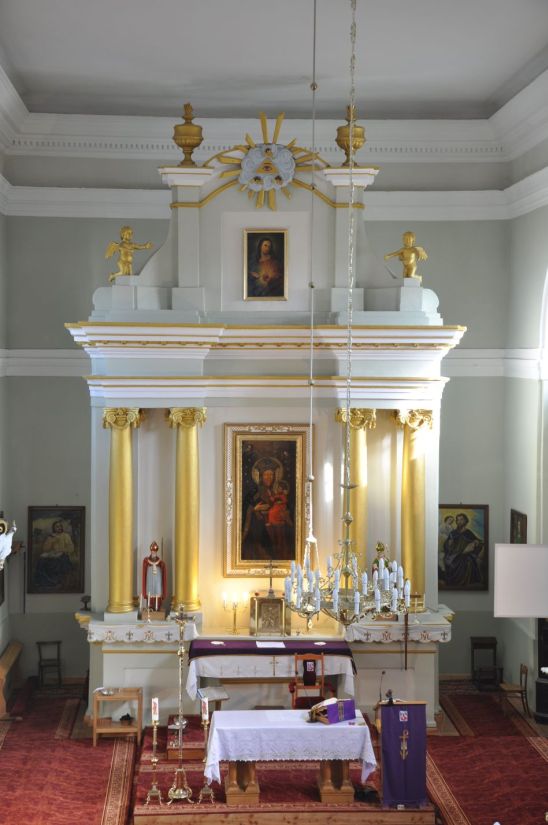prezbiterium stoi duży, murowany ołtarz, ozdobiony czterema kolumnami. W ołtarzu znajduje się najcenniejszy obiekt zabytkowy, czyli obraz olejny Matki