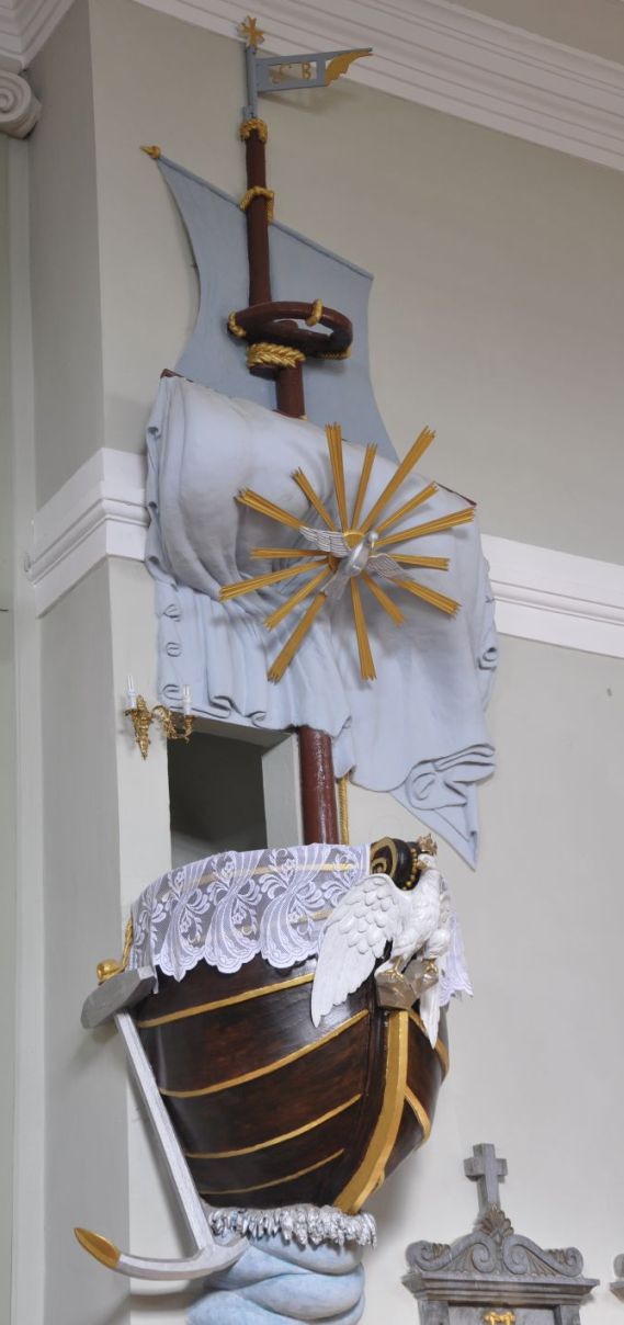 ambona w kształcie łodzi ze wzdętymi żaglami i orłem na dziobie nawiązująca do sceny z Ewangelii, kiedy Chrystus przemawiał do tłumów z łodzi nad